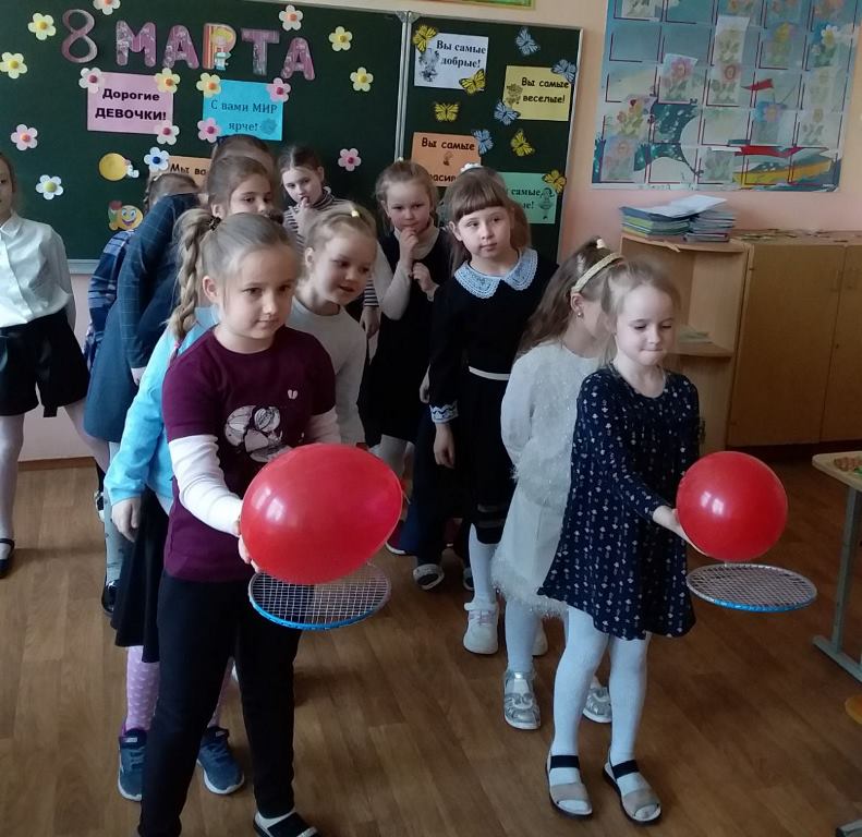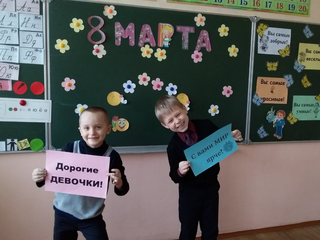 Мальчики порадовали одноклассниц чтением поздравительных стихотворений, исполнением весёлых песен.