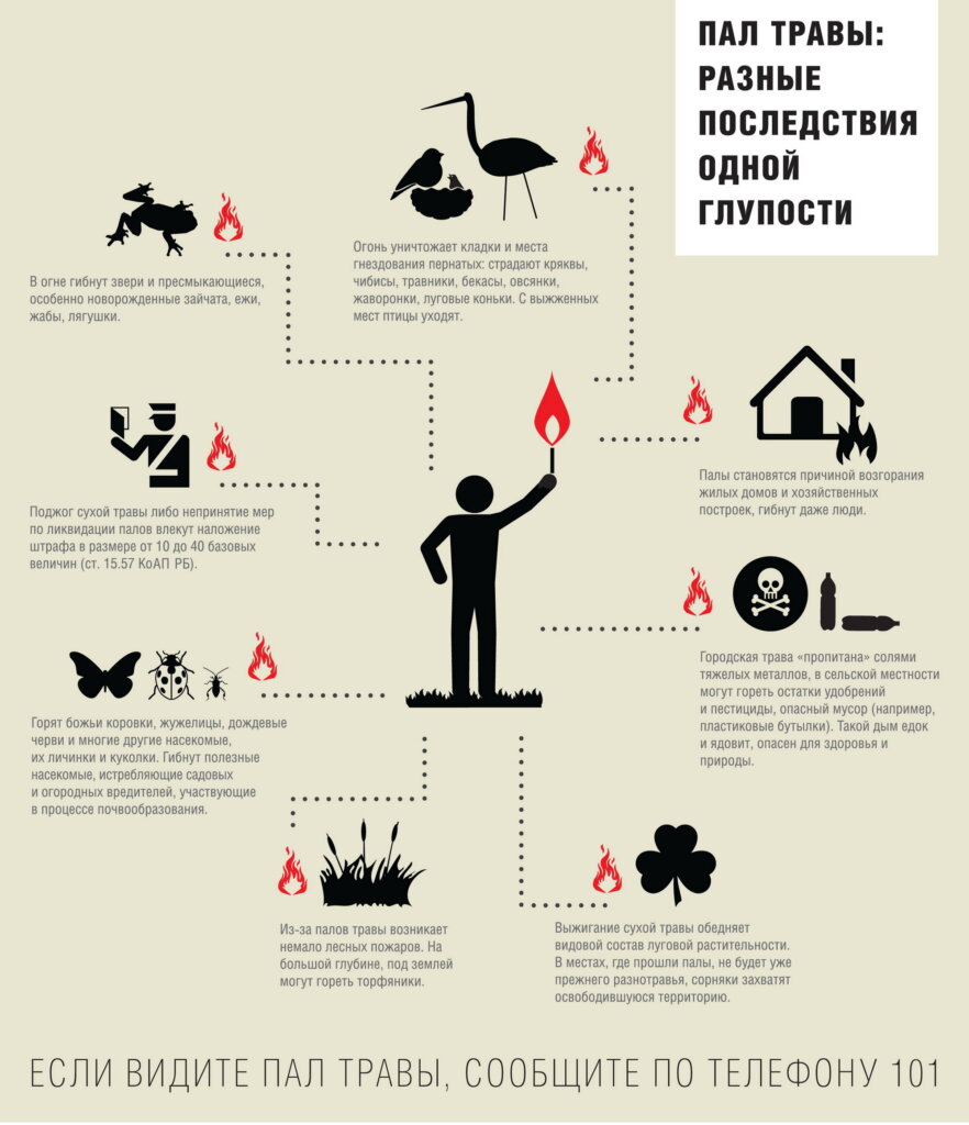 Многие граждане даже не подозревают, какой вред наносят окружающей среде, пытаясь с помощью огня убрать прошлогоднюю траву. Это явление ежегодно приобретает регулярный характер и нередко становится сильнейшим разрушительным фактором, негативно влияющим на окружающую среду, материальные блага и жизнь человека. К сожалению, ни высокие штрафы, ни ущерб, принесенный весенними палами, не могут остановить людскую беспечность.