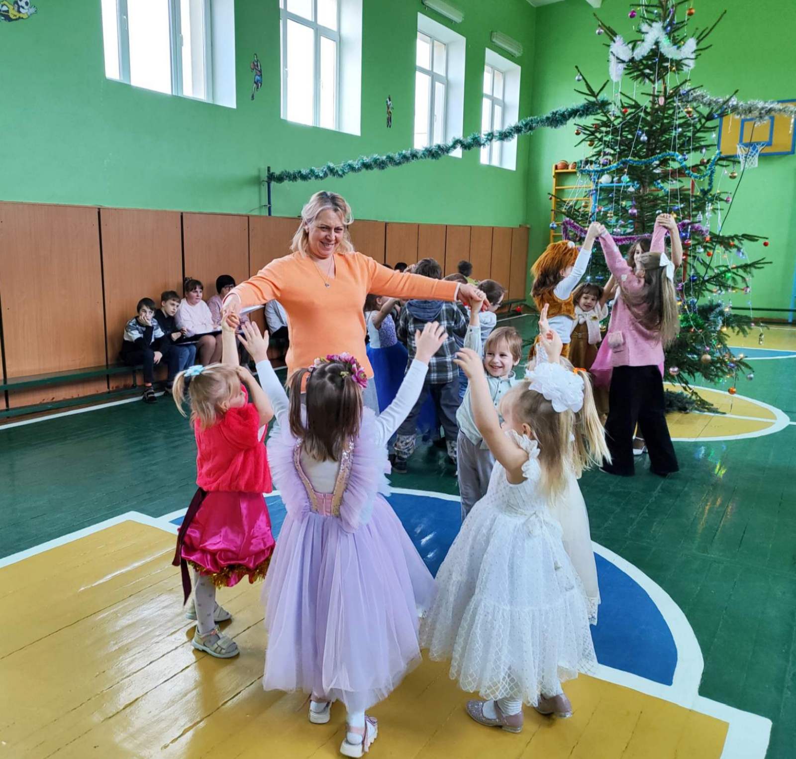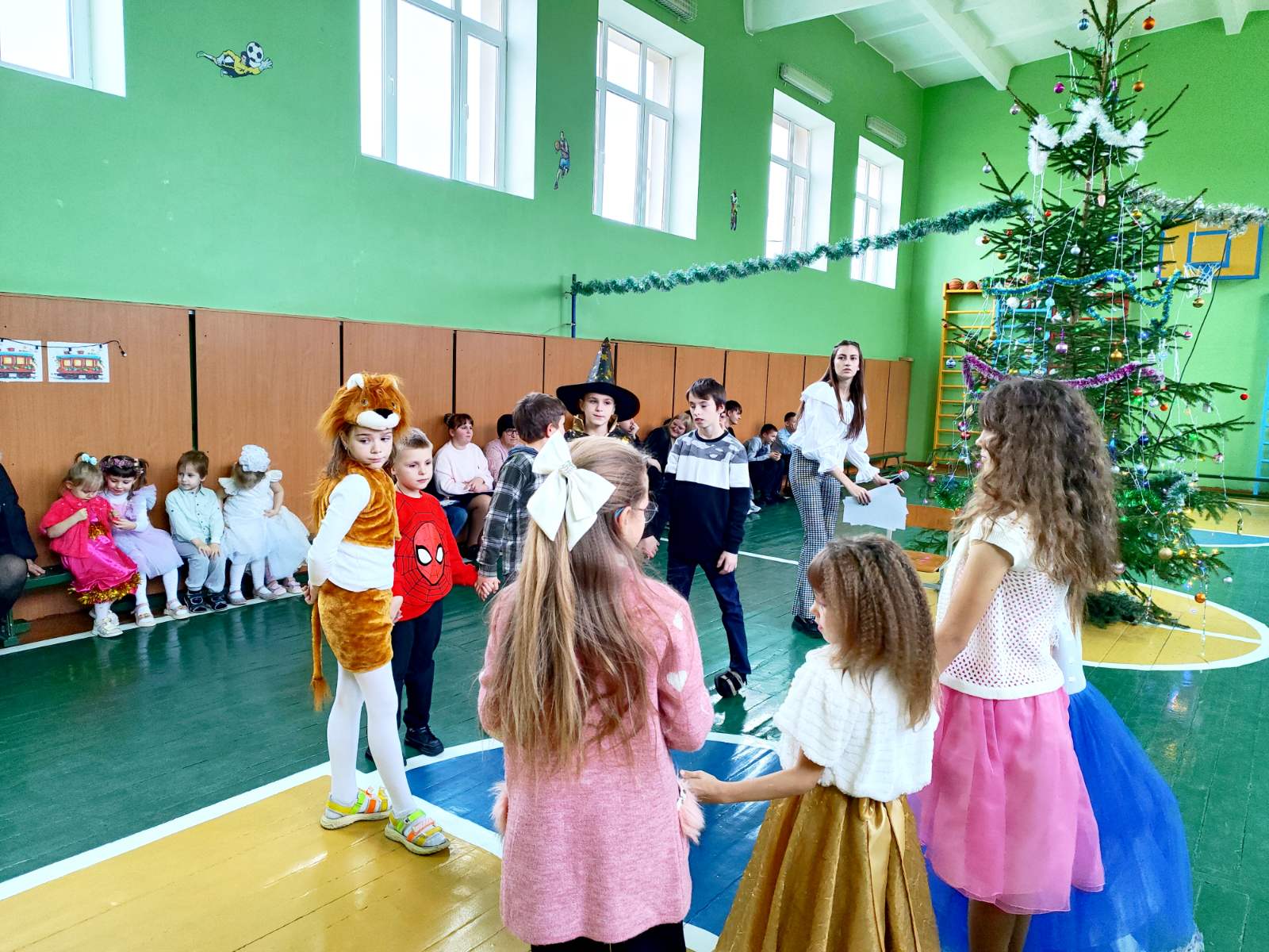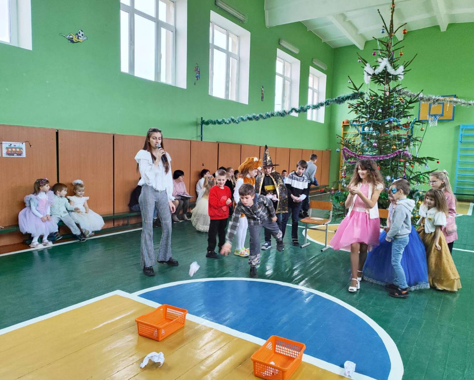 Девчонки и мальчишки отгадывали загадки на тему зимы и Нового года, пели новогодние песни и танцевали, а также играли с Дедом Морозом и Снегурочкой в подвижные игры.