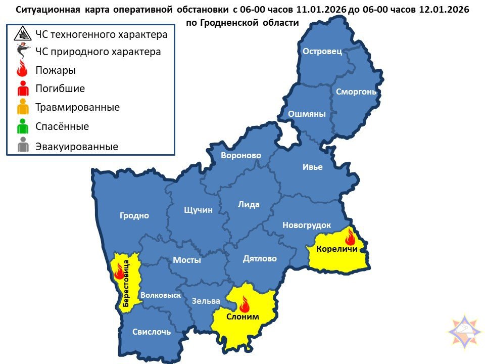 За сутки подразделениями МЧС области совершен 31 выезд, из них 3 — на пожары: Берестовицкий район — пожар хозяйственной постройки; Слонимский район — пожар хозяйственной постройки; Кореличский район — пожар жилого дома. Люди не пострадали.
