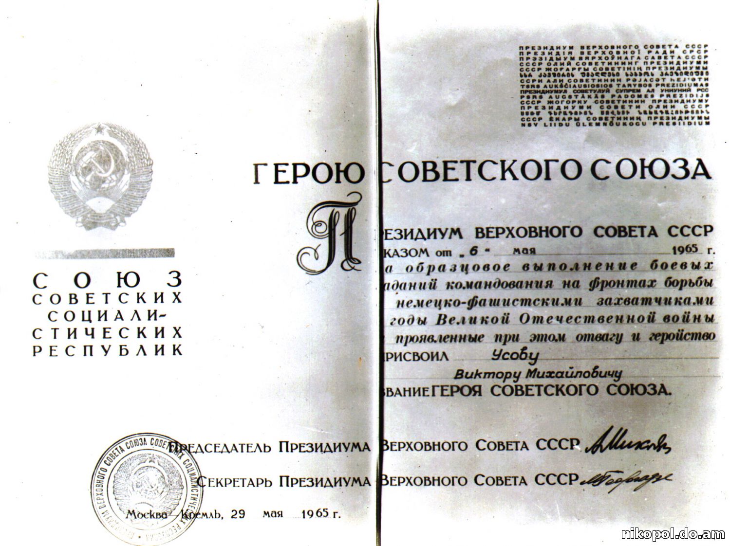 А в мае 1965 года в честь 20-летия Победы над фашистской Германией Указом Президиума Верховного Совета СССР лейтенанту В.М. Усову присвоено посмертно звание Героя Советского Союза.