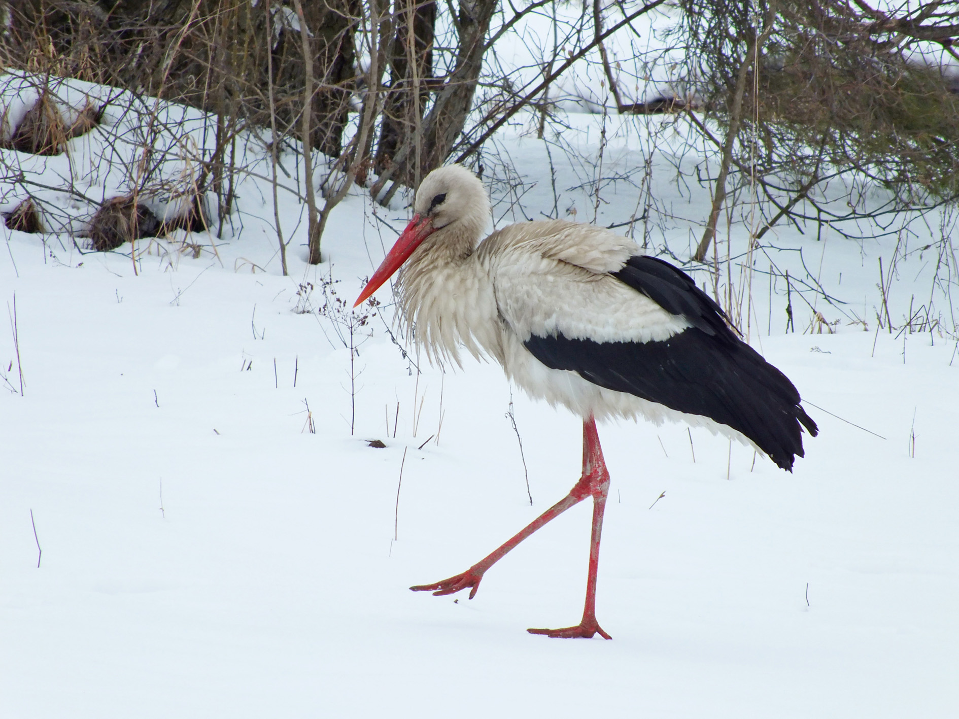 небольшую в снегу неподалеку, посыпали соломы, и салаки туда несколько рыбок положили. Долго ждать не пришлось – не зря говорят, что голод не тетка. На следующий день аист снова наведывался несколько раз в знакомое место. После длительного перелета запас энергии ему очень кстати.