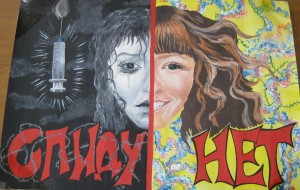 Першае месца журы прысудзіла плакату “СНІДу – не!” (на здымку), які выканалі вучаніцы гімназіі аг.Пагранічны Дзіяна Кулікова і Кацярына Мельнічак.