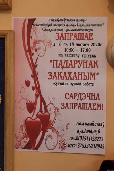 День всех влюбленных – праздник неоднозначный, но если расценивать его как еще один повод для теплых нежных слов и проявлений искренних чувств, то почему бы и не отметить его. Сделать это оригинально предлагают мастера Берестовицкого Дома ремесел. Проявив всю свою фантазию и талант, они организовали выставку-продажу сувениров ручной работы под названием «Подарок влюбленным».