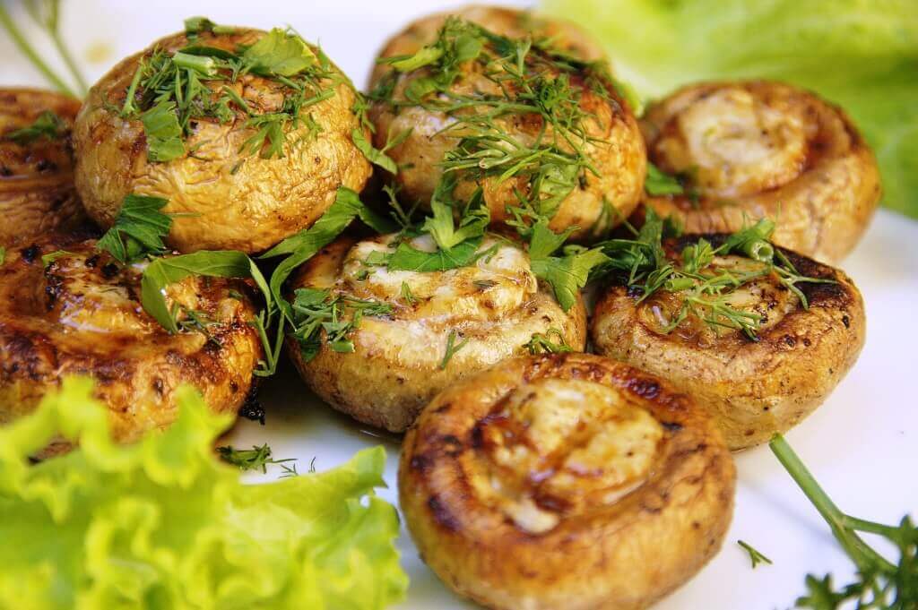 Неабходна ўзяць шампіньёны большага памеру, адрэзаць у іх ножкі і дробна парэзаць. Асобна шынкуем цыбулю, моркву націраем на буйной тарцы і разам з парэзанымі ножкамі грыбоў смажым на патэльні, крыху падсаліўшы. Пасля гэтым напаўняем капелюшы грыбоў. Выкладваем іх на процівень, пасыпаем цёртым сырам і выпякаем у духоўцы 15-20 хвілін.