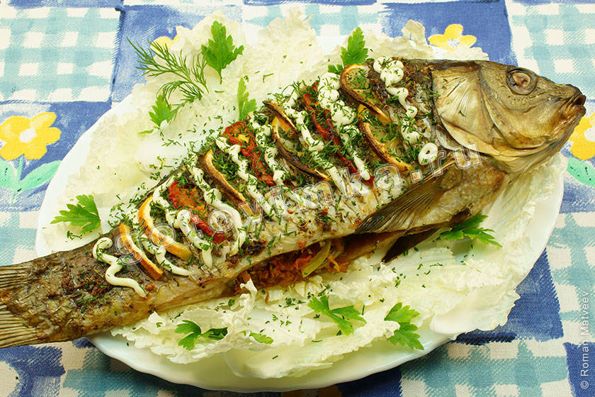 Падрыхтоўваем рыбу: чысцім, мыем, націраем соллю, прыправай для рыбы, часнаком, маянэзам. Лепш за ўсё даць рыбе замарынавацца некалькі гадзін. Запякаем карпа пры тэмпературы 180 градусаў на працягу 50-70 хвілін (у залежнасці ад памеру рыбы). Пасля гатоўнасці апырскваем яго лімонным сокам, упрыгожваем долькамі лімона і маянэзнай сеткай.