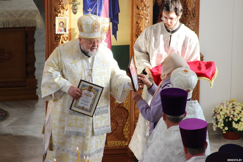 После Божественной литургии, состоялся Крестный ход вокруг храма. Затем состоялось награждение церковными наградами активных прихожан и людей, которые внесли вклад в строительство храма. Медалью Коложского Креста II степени награжден настоятель храма святой преподобной Евфросинии Полоцкой протоиерей Сергий Шелест; медалью Коложского Креста III степени – директор компании «Камака компани» Александр Наумович, председатель Берестовицкого райисполкома Антон Кулисевич, директор КСУП «Пограничный-Агро» Николай Примаченко; медалью Коложской Одигитрии III степени начальник Берестовицкого РЭС Анатолий Гончарик, глава фермерского хозяйства «Раница» Леонид Курганский, певчий храма Василий Макарчук. Архиерейскими грамотами отмечены регент храма Татьяна Метелица, певчие Нина Хомко и Вера Хороменда, казначей храма Нина Малашкевич.