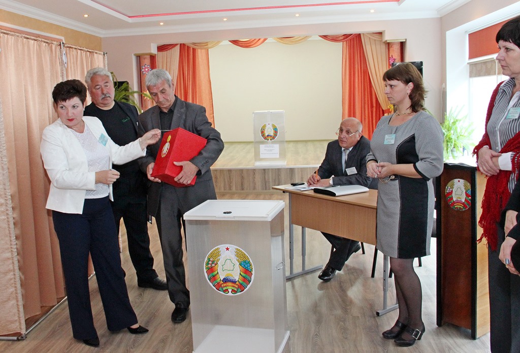 Как и в реальной ситуации, в актовом зале Берестовицкой средней школы, было оборудовано помещение для голосования в соответствии с требованиями избирательного законодательства. В нем были размещены рабочие места для членов участковой комиссии, наблюдателей, установлены ящики трех видов (для голосования в день выборов на участке для голосования, для досрочного голосования и для голосования по месту нахождения избирателей), кабины для голосования, сейф. Кстати сказать, на всех участках для голосования в день выборов будут использоваться прозрачные урны. Здесь же находился и информационный стенд, на котором была размещена информация о гипотетических кандидатах в президенты и образец заполнения бюллетеня.