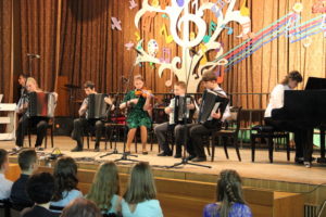 Каждый выпуск в школе искусств – это творческие личности, новые звездочки, которые зажглись в созвездии талантов нашей Берестовитчины. Какие они яркие и неповторимые, ребята продемонстрировали во время отчетного концерта. Выступили образцовый эстрадно-инструментальный ансамбль «Tutti», образцовые хоры «Манжерок» и «Кампанелли», инструментальный ансамбль «Акколада», вокально-инструментальный ансамбль «Relеasе», вокальные группы выпускников, инструментальные (Илья Козловский и Любовь Антоненко) и вокальные (Алексей Рыгосик и Ульяна Сулавко) дуэты, сольные исполнители (Ульяна Сулавко, Ирина Грек, Александр Гутовский, Илья Козловский, Юрий Карпуть, Юлия Рыжевская, Антон Сорока, Константин Каскевич, Анастасия Окладникова, Анастасия Курмель). В фойе школы можно было познакомиться с выставкой творческих и учебных работ выпускников и учащихся художественного отделения (учителя Андрей Вторушин и Анастасия Ефимик).