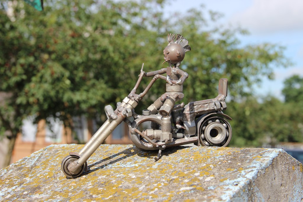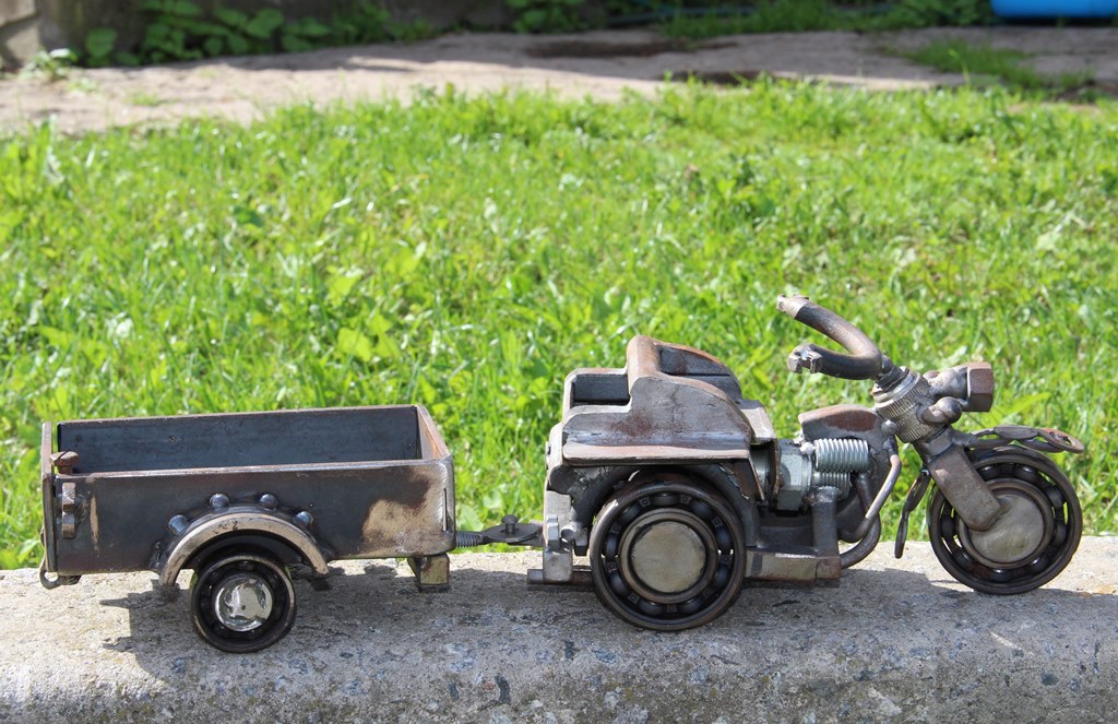 И хотя работу сварщика я бы не назвала рутинной, но чтобы отвлечься от изготовления заборов и лестниц, которые приходится делать по конкретному заказу, Владимир свою творческую натуру реализует в создании интересных моделей из металлолома. В ход идет все, что поддается сварке: гайки, болты, подшипники, свечи, шайбы и другие отработанные автозапчасти, куски жести. Из них появляются удивительные машинки, мотоциклы, квадрациклы, вертолеты и другие модели.