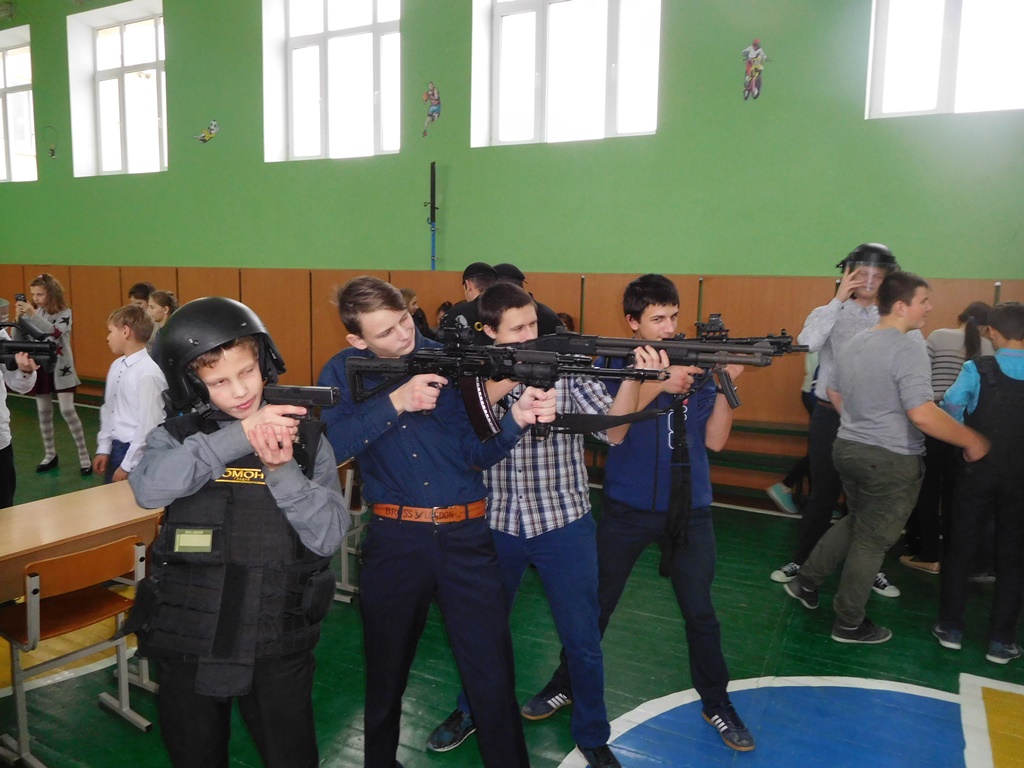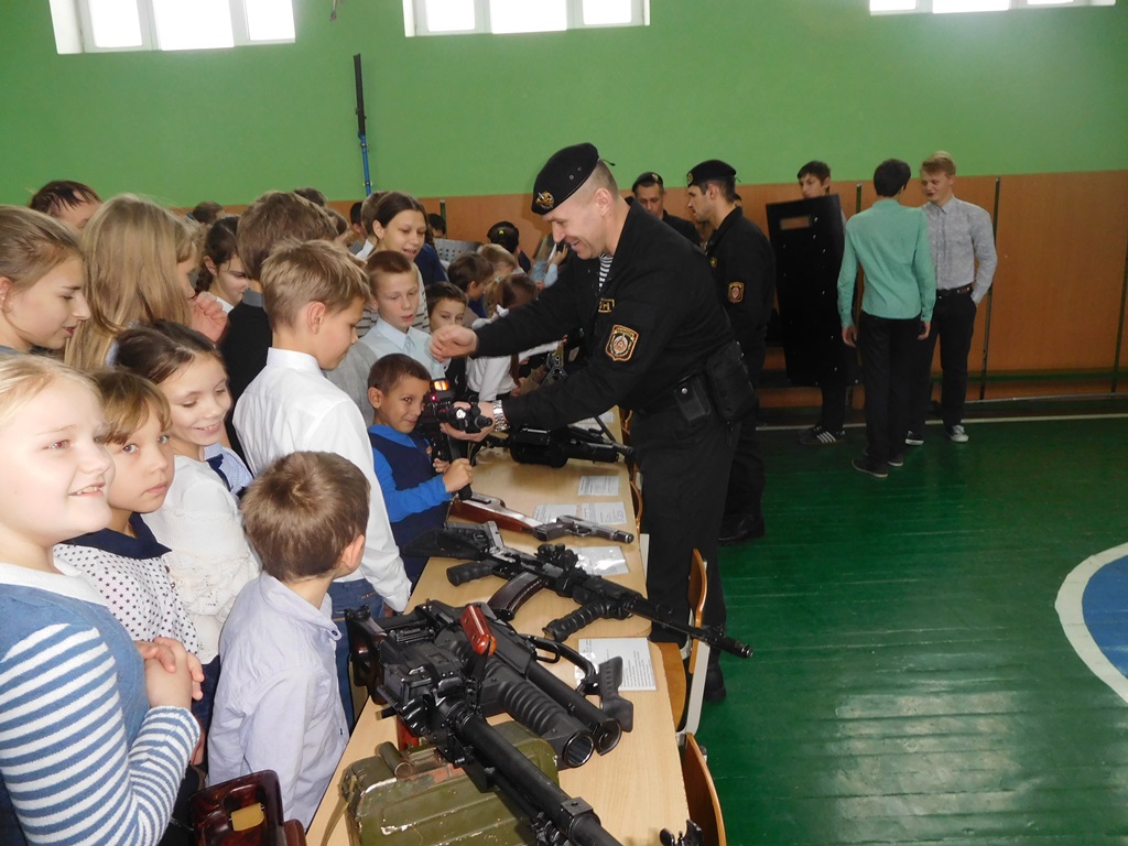 Сотрудники ОМОН продемонстрировали учащимся боевое оружие, средства индивидуальной защиты и активной обороны, находящиеся на вооружении сотрудников органов внутренних дел.