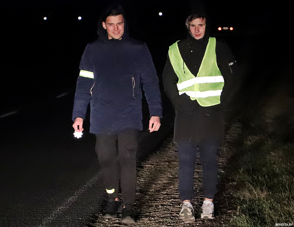 Для эксперимента был выбран неосвещенный участок автодороги Р100 длиной 300 метров между деревней Людвиново и агрогородком Старый Дворец. Через каждые 50 метров на нем была нанесена разметка. На нулевой точке отсчета стояли три человека. В середине находился представитель ГАИ без световозвращающих элементов. Один из волонтеров БРСМ был одет в световозвращающий жилет повышенной видимости желто-лимонного цвета, а второй волонтер БРСМ был экипирован тремя различными видами световозвращающих элементов: нарукавной повязкой, гибкой лентой на икре ноги и в руках он держал брелок-фликер.