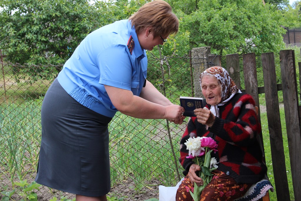 У сувязі з дасягненнем 100-гадовага ўзросту доўгажыхарам выдаецца новы пашпарт. І гэты дакумент Веры Савасцьянаўне ўручыла старшы інспектар групы па грамадзянству і міграцыі РАУС Людміла Добка, якая павіншавала бабулю з юбілеем і пажадала яшчэ доўгіх гадоў жыцця.