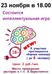 Внимание! Очередной интеллектуальный турнир ждет старых и ищет новых героев. Встреча состоится уже в четверг, 23 ноября, в 18.00, на базе ресторана «Колос» (г.п. Большая Берестовица).