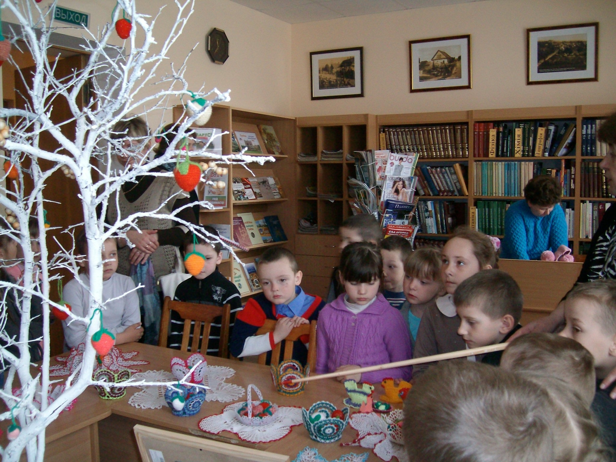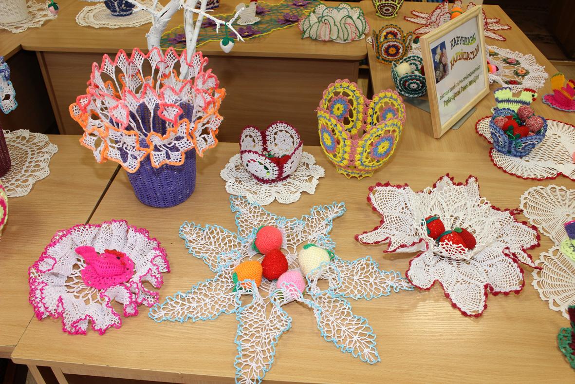 Увазе наведвальнікаў прадстаўлены цудоўныя сурвэткі і дарожкі, прыгожыя каляровыя цукерніцы, адмысловыя падвазонніцы, вазы і кашолачкі. Вачэй не адвесці ад усёй гэтай прыгажосці, зробленай рукамі простай сціплай жанчыны. Тут жа і цацкі, звязаныя кручком, – курачкі, трускаўкі, суніцы, кветкі. Сапраўдная забава для дзяцей! Маленькія чытачы з непадробнай цікавасцю і задавальненнем мацаюць мяккія і яркія вырабы.