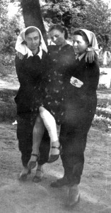 На следующем снимке можно увидеть участниц соревнований санитарных дружин. Эта фотография сделана годом раньше, в 1958 году. Моя мама находится справа, слева – В.К. Костюкевич, в середине – «пострадавшая». К сожалению, ее фамилию я не знаю.