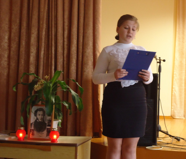 Свечи, стопка книг, портрет поэта. Звучит »Романс» Г.Свиридова из «Метели». На фоне затихающей музыки выходят ведущие Карина Гойлик и Ольга Шишпаронок. Они открывают литературную гостиную, посвященную памяти великого русского поэта, писателя и драматурга Александра Пушкина, которая проходила в стенах Макаровского яслей-сада-средней школы 27 февраля.