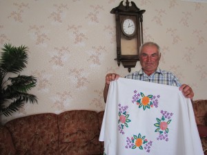 Убачанае ж пераўзышло тое, што я чакала тут знайсці. Дом патанае ў кветках. Вышытыя іконы беражліва ахінаюць аздобленыя тонкай вышыўкай ручнікі. У кожным пакоі гарачым полымем і стракатымі фарбамі цвітуць кветкі, яны на пакрывалах, падушках і нават на самаробным дыванку на падлозе ў малым пакоі. А муж Яўгеніі Рыгораўны Іван Іосіфавіч з гонарам паказвае нам абрус, які быў так цудоўна вышыты яго жонкай, калі яна была яшчэ зусім дзяўчынкай, у 13 гадоў! Мы дзівімся з Ганнай Іосіфаўнай на карпатлівую работу, ахайную, далікатную, выкананую амаль дзіцячымі яшчэ рукамі, у якой адчуваецца сапраўднае натхненне. Такім адметным абрусам можна было ўпрыгожыць стол хіба толькі на вялікае свята, напрыклад, на Нараджэнне Хрыстова або Вялікдзень. Ён і сам — свята!