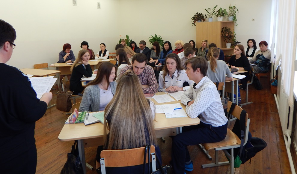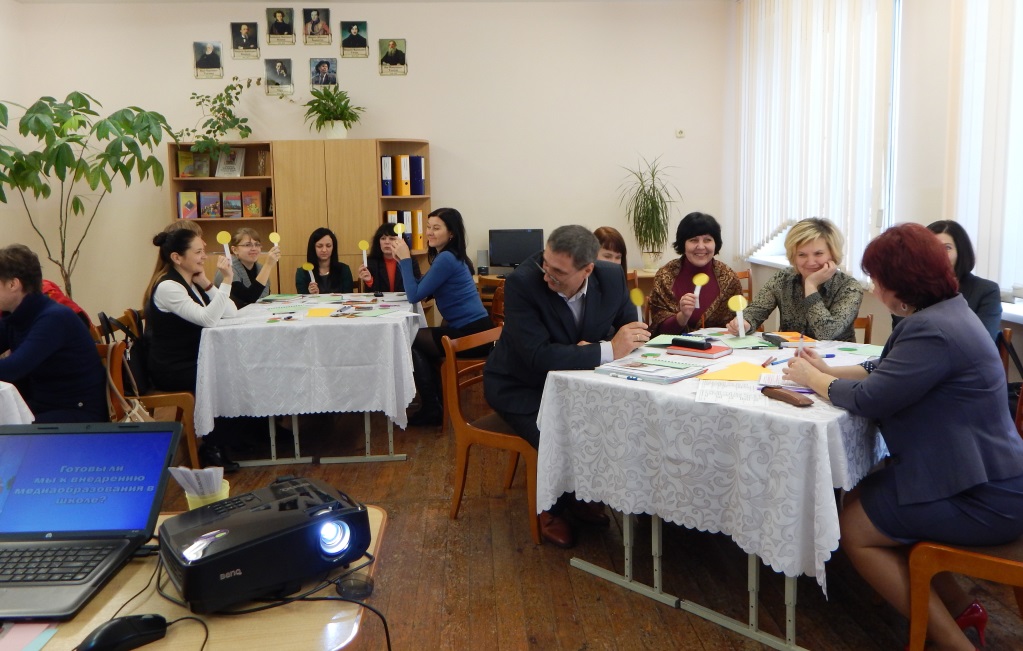 Далее заместителям директоров был презентован опыт работы по теме инновации.  Стендовый доклад, представленный Людмилой Владимировной Коник, рассказал, как в процессе работы с медийными текстами происходит формирование медиакультуры учащихся на первой ступени общего среднего образования. Учителя-инноваторы Ольга Николаевна Коник и Тереса Антоновна Король продемонстрировали, как, используя различные медиаисточники, сделать уроки русского языка и литературы ярче и интереснее.  На фрагменте урока по учебному предмету «Обществоведение», проведённом Людмилой Алексеевной Турок, присутствующие увидели, что системное использование медиаресурсов положительно сказывается на  развитии критического мышления, умении сравнивать и анализировать.