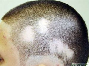 При локализации патологического процесса на волосистой части головы в очагах поражения отмечается обламывание волос (причем облом происходит чаще всего на уровне 3-8 см от корня волоса). Происходит образование бело-серой муфты вокруг основания волоса, которая хорошо видна невооруженным глазом. Основания обломанных волос с легкостью выдергиваются при помощи пинцета. Если пригладить обломанные волосы, то они не восстанавливают свое прежнее положение (в отличие от здоровых).