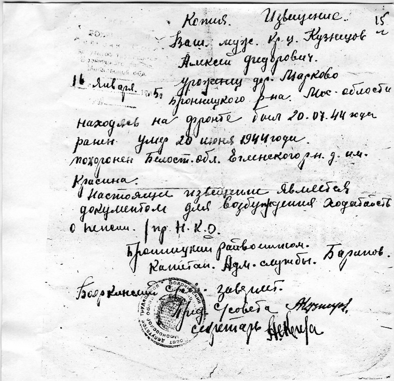 В январе 1945 года бабушка Виктора Степанова, Анна Ивановна, получила похоронку на мужа Алексея Федоровича Кузнецова, в которой говорилось, что «Алексей Федорович умер от ран 20 июля 1944 года и похоронен в д. им. Красина, Егленского района, Белостокской области.». К трагедии от потери любимого мужа и опоры семьи, к состоянию безысходности и разом рухнувших надежд прибавилось еще одно гложущее чувство: невозможность посетить могилу погибшего, чтобы отдать дань его памяти, чтобы возложить