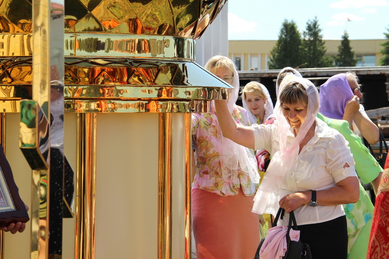 После литургии был совершен крестный ход к месту строящегося храма, где и состоялось освящение нового купола и креста. После молебного пения Владыка Артемий окропил крест, купол и всех собравшихся святой водой. Перед водружением купола и креста каждый желающий смог подойти и приложиться к ним.