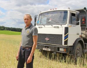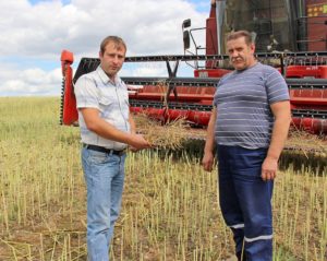 — На возвышенных участках у нас уже «подошло» под уборку порядка 100 гектаров рапса, — говорит главный агроном хозяйства Андрей Гришкевич (на снимке слева). — Всего этой культурой занято 300 гектаров. В ближайшие дни постепенно будет дозревать рапс и на остальных площадях.