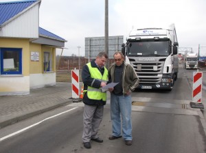 На снимке: старший инспектор ПВГК «Берестовица» Петр Амельянчик объясняет водителю дальнейший маршрут передвижения в условиях ограничения нагрузки на оси.