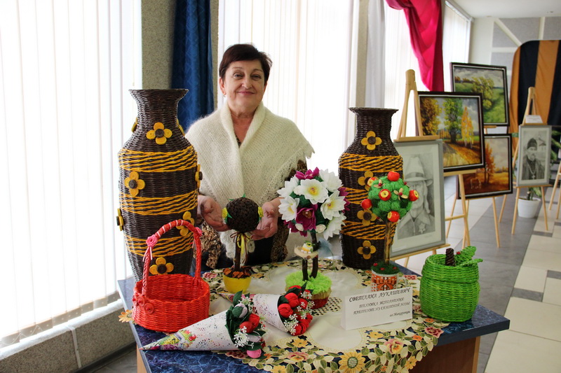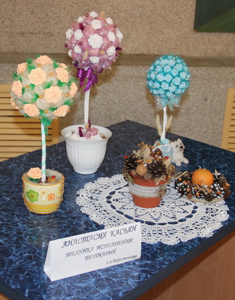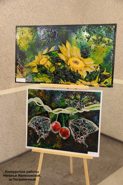 Каждый конкурсант в номинации «изобразительное и декоративно-прикладное искусство» представил по пять своих работ. На выставке можно было полюбоваться живописью, графикой, росписью по стеклу, вышивкой, в том числе работами в техниках «алмазной» вышивки и вышивки бисером, керамикой, изделиями из соломки, бумажной флористикой, всевозможными топиариями, изделиями, плетенными из газет, и выполненными в технике скрапбукинг. Всего и не перечислить!