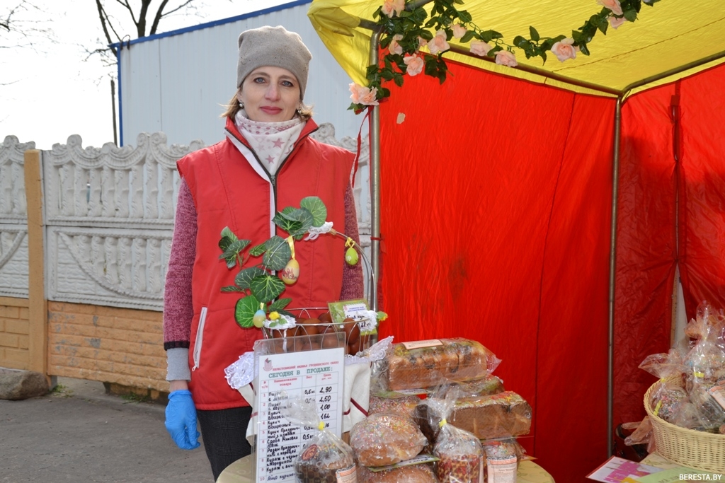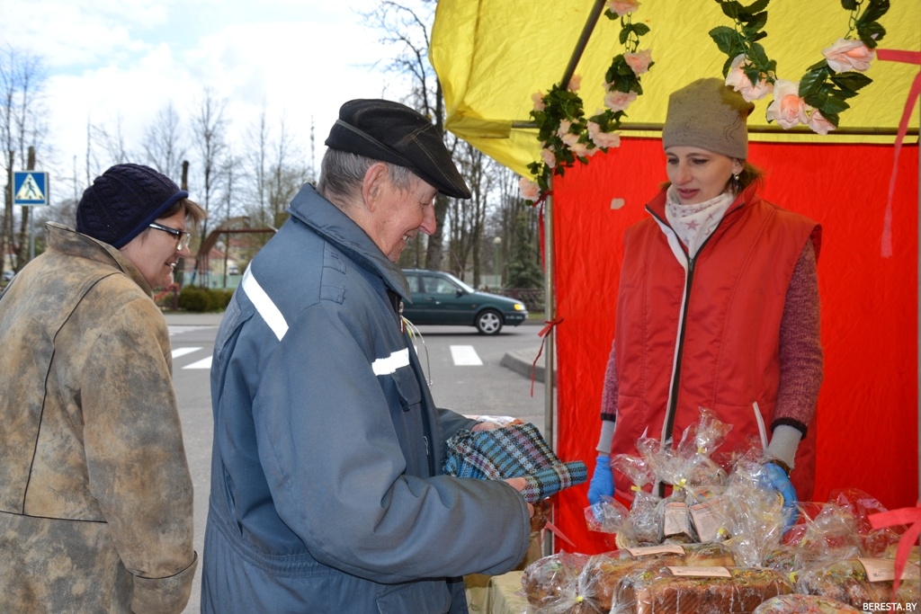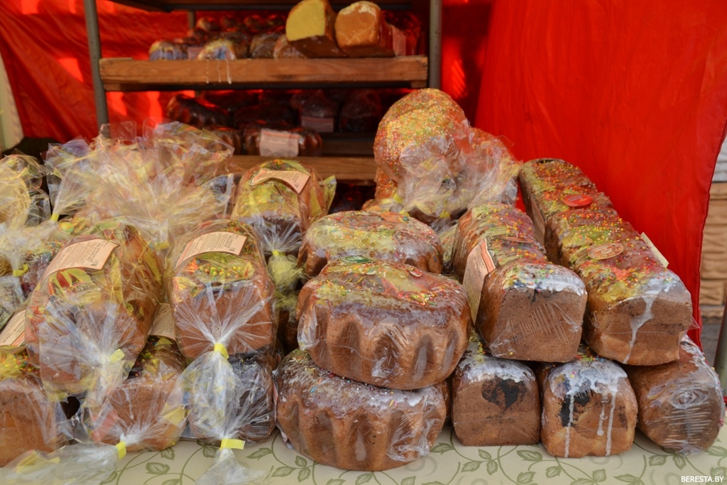 Возле торговой палатки с праздничной продукцией местного хлебозавода и кондитерского цеха общепита людей собралось немало. Здесь берестовичане могли приобрести крашеные яйца и традиционный пасхальный кулич. К ассортименту этого угощения организаторы ярмарки подошли с креативом. Покупателей дожидались 7 видов пасхальных куличей разнообразных форм, с разными начинками: с маком, корицей, вишней, изюмом, смородиной. Так что даже гурманам было из чего выбирать. Кондитеры не поскупились и на украшения: куличи пестрили съедобными розочками, традиционной белой помадкой и декоративной посыпкой.