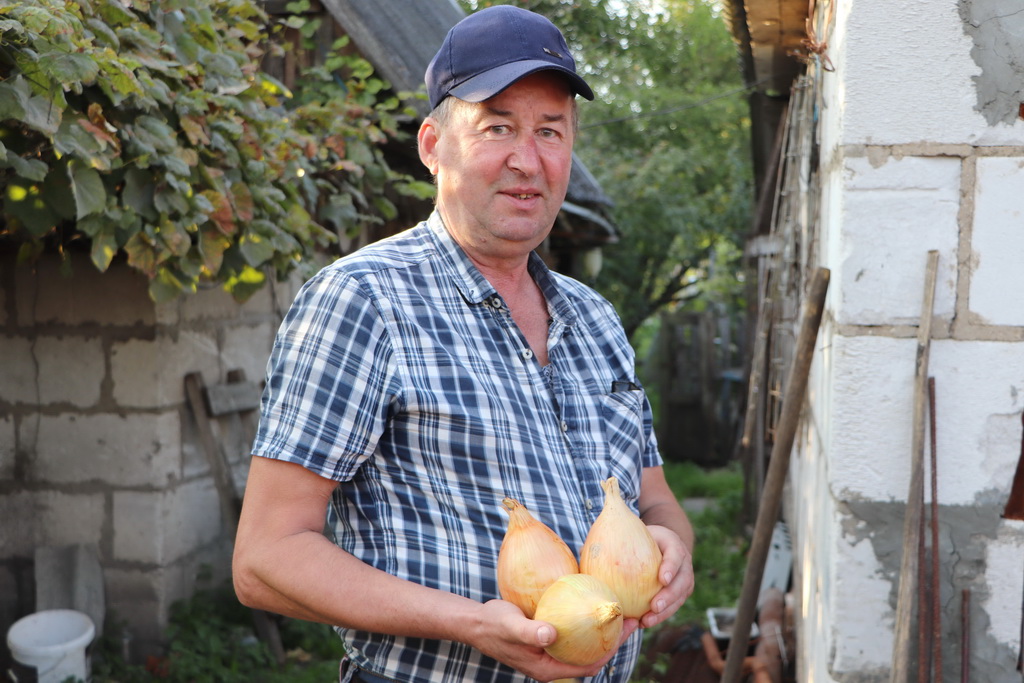 Николай Кузьмич с крупными экземплярами лука Эксибишен