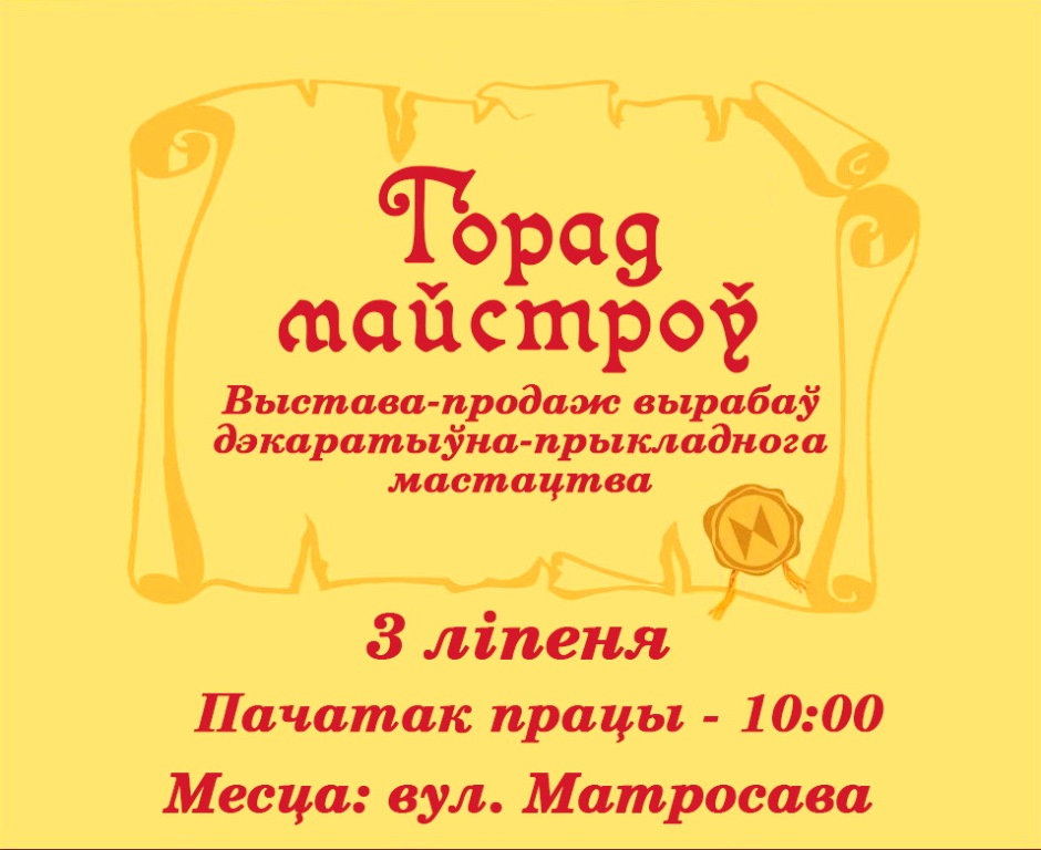 13.00- 14.00 – горад майстроў. Выстава народнай творчасцi. Майстар-класы народных умельцаў “Скарбонка талентаў”