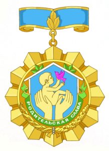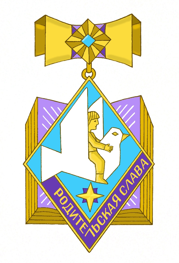 Описание знака: в центре солнечного диска с 12-ю лучами находится дом, внутри которого две родительские ладони поддерживают ребенка с птицей удачи в руках. Дом окружен листьями, ветвями лавра и дуба и лентой с надписью: «Родительская слава». Основу знака составляют три завета родителей: построить дом, посадить дерево, воспитать ребенка.