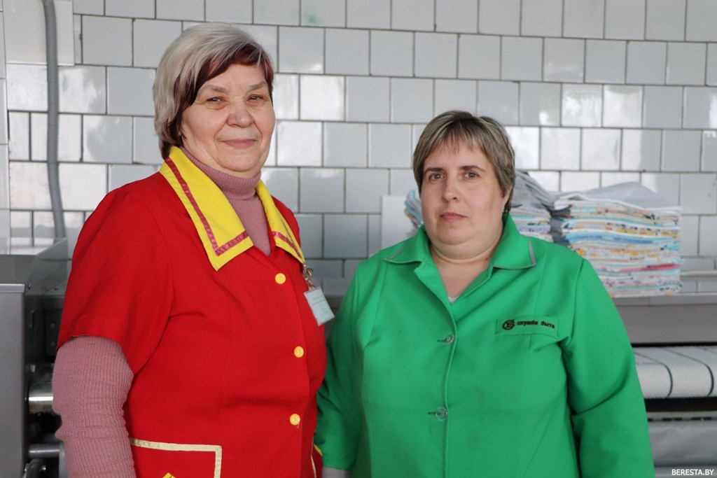 Здесь уже 10 лет трудится Алла Полищук, мастер прачечной. А разделяет с ней трудовые будни Жанна Эйсмонт, оператор прачечного оборудования. Она работает здесь уже 9 лет. Круг клиентов солидный. В небольшой прачечной обслуживают многие учреждения Берестовицкого и Свислочского районов. А это семь пограничных застав, одна воинская часть, все больницы и амбулатории, сельскохозяйственные организации, ресторан, садики, школы и детские лагеря.