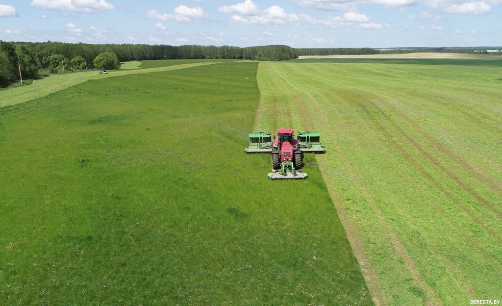 В минувшую пятницу мы побывали на кормовом поле, расположенном по обе стороны дороги в районе деревни Ивашковцы. Слева кормоуборочное звено завершало подбор и измельчение травяной массы, а справа две косилки – 9-метровая и 3-метровая – готовили дальнейший фронт работ для кормозаготовителей.