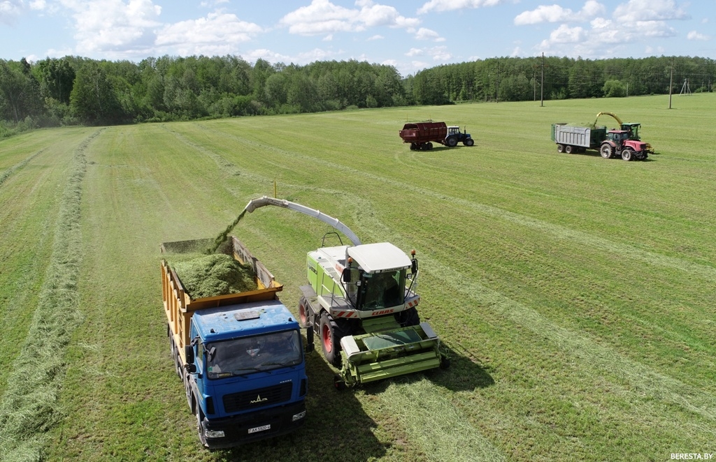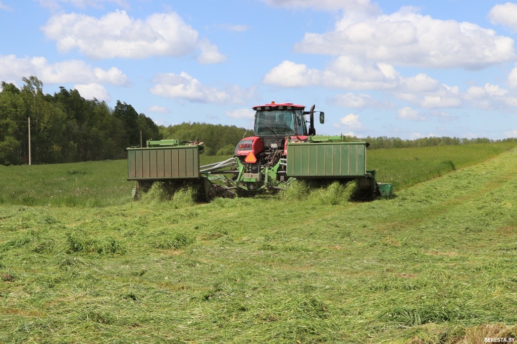 В минувшую пятницу мы побывали на кормовом поле, расположенном по обе стороны дороги в районе деревни Ивашковцы. Слева кормоуборочное звено завершало подбор и измельчение травяной массы, а справа две косилки – 9-метровая и 3-метровая – готовили дальнейший фронт работ для кормозаготовителей.