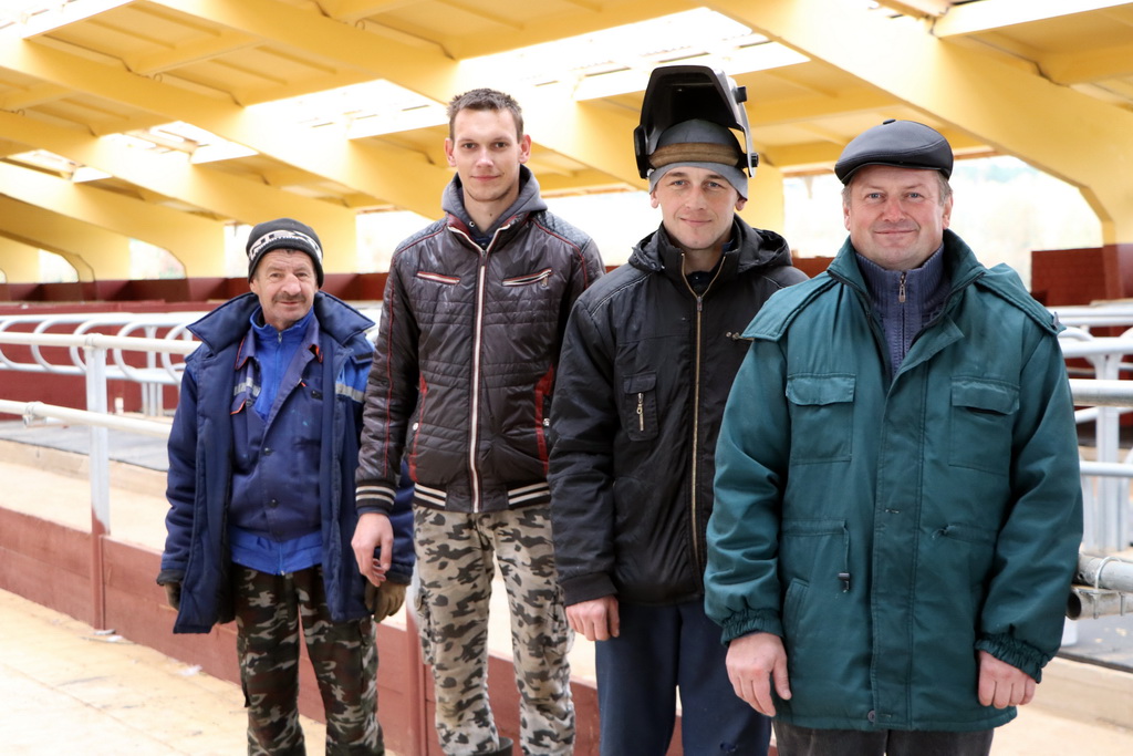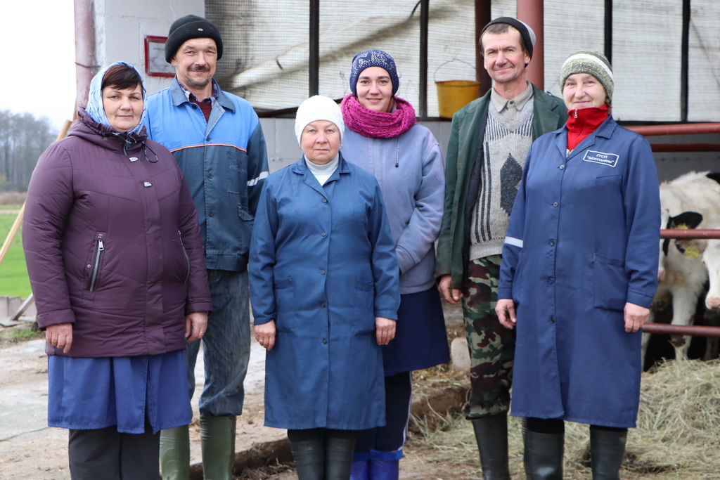 Бригадир Эдуард Козел, операторы машинного доения Ольга Крупович и Алла Чинько, приготовитель кормов Елена Лебедевич, животновод Светлана Климчук, зоотехник-селекционер Екатерина Ладыженская, слесарь Александр Жевнерович.