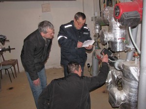 На снимке: инспектор Энергонадзора Александр Ясинский проверяет работу теплоузла с ответственным за энергохозяйство лицея Игорем Чечетко и заведующим хозяйством Анатолием Ситько.