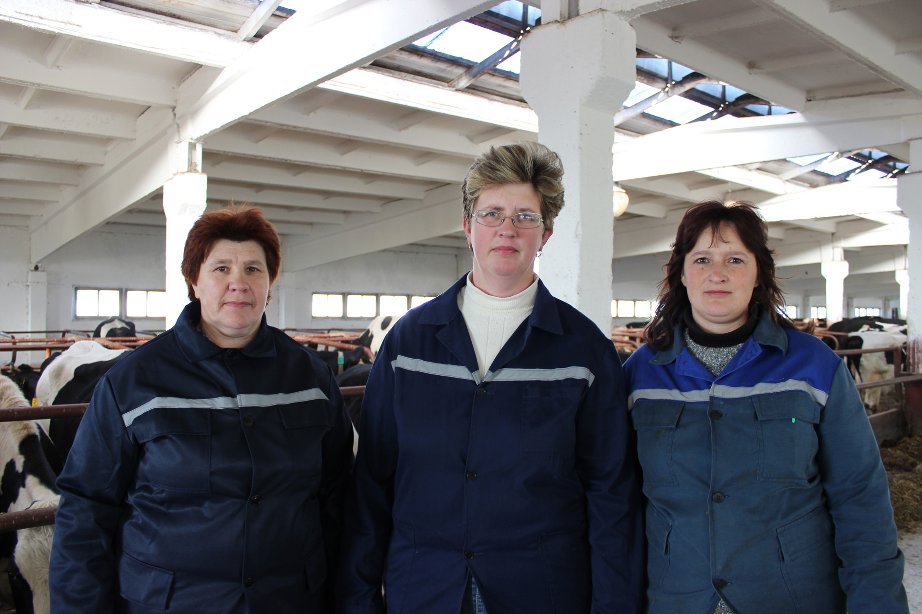 Животноводы Валентина Трайгель и Светлана Николайчик с управляющей МТК «Ремутевцы» Инной Обухович
