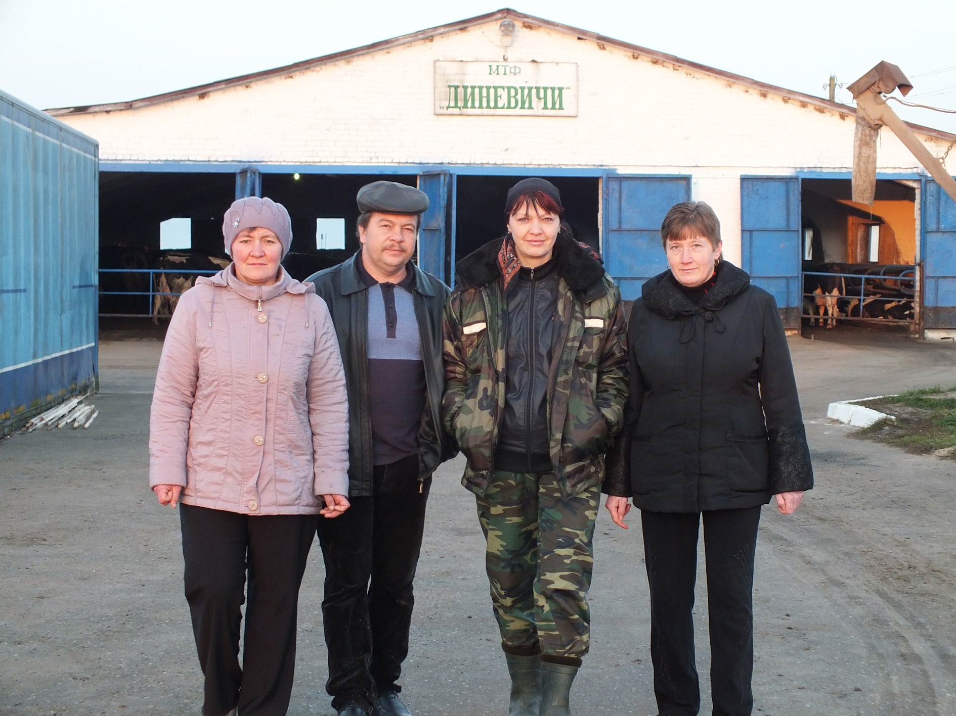 Весомый вклад в производство молока в хозяйстве вносит коллектив молочнотоварной фермы «Диневичи», которую возглавляет Александр Якута. Четверть века трудится здесь дояркой Оксана Войшель (крайняя справа), на протяжении 16 лет доит коров на этой ферме Марина Михайловская (крайняя слева), а несколько лет назад влилась в дружный коллектив и Татьяна Остапчук.
