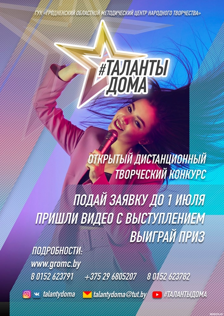 Впервые в Беларуси! Объявлен приём заявок на открытый дистанционный творческий конкурс «#ТАЛАНТЫДОМА». К участию приглашаются абсолютно все желающие – возраст, образование и род занятий не имеют значения. Главное – креатив, артистизм и умение показать себя на все 100%. Вокалисты, музыканты, стендап-комики, клоуны и акробаты – все обладатели уникальных способностей могут побороться за почётный Гран-при и суперприз, прославиться на всю страну, получить мощный импульс для дальнейшего развития и сделать уверенный шаг к большой сцене.