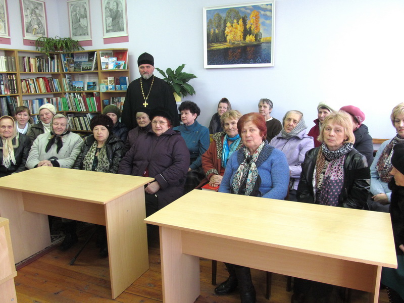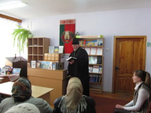 – У сераду, 15 сакавіка, у нас адбылася сустрэча дарослых наведвальнікаў бібліятэкі з настаяцелем храма Святой прападобнай Еўфрасінні Полацкай, протаіерэем Сергіем Шэлестам. Бацюшка прадставіў навінкі праваслаўнай літаратуры з царкоўнай бібліятэкі, а бібліятэкары раздалі ўдзельнікам сустрэчы тэматычныя буклеты “Праз кнігі – да духоўнасці” з рэкамендацыйным спісам праваслаўнай літаратуры з кніжнага фонду філіяла. У суботу, 18 сакавіка, свяшчэннік сустрэўся з маленькімі чытачамі. Дзецям былі прадэманстраваны дакументальныя фільмы праваслаўнай тэматыкі з відэатэкі мультымедыйнага цэнтра бібліятэкі. На працягу Тыдня дзейнічала выстава праваслаўнай літаратуры.
