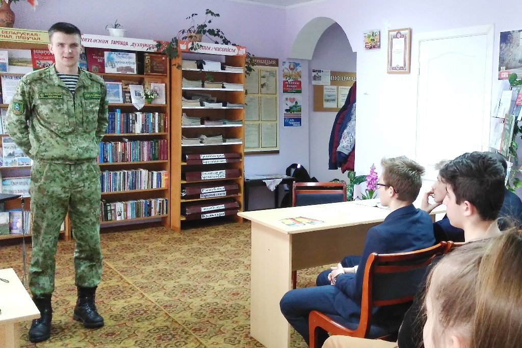 Вниманию ребят был представлен документальный фильм «Право служить на границе». С агитационной беседой выступил заместитель начальника пограничной заставы «Семеновка» лейтенант Андрей Жолнерчик. Андрей Анатольевич рассказал о том, куда можно поступить, чтобы служить в пограничных войсках, о ходе вступительной компании в высшие военные учебные заведения, преимуществах профессии офицера- пограничника, а также об условиях устройства на военную службу по контракту. Учащиеся получили компетентные ответы на интересующие их вопросы.