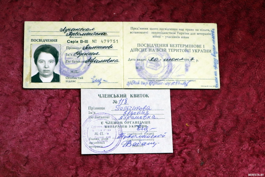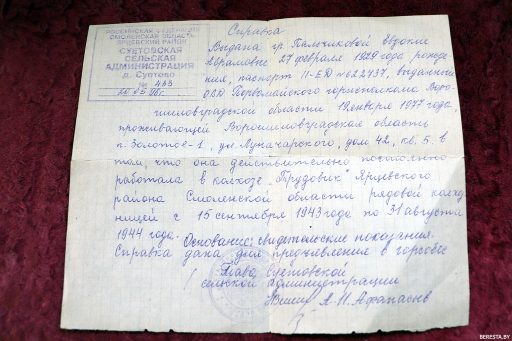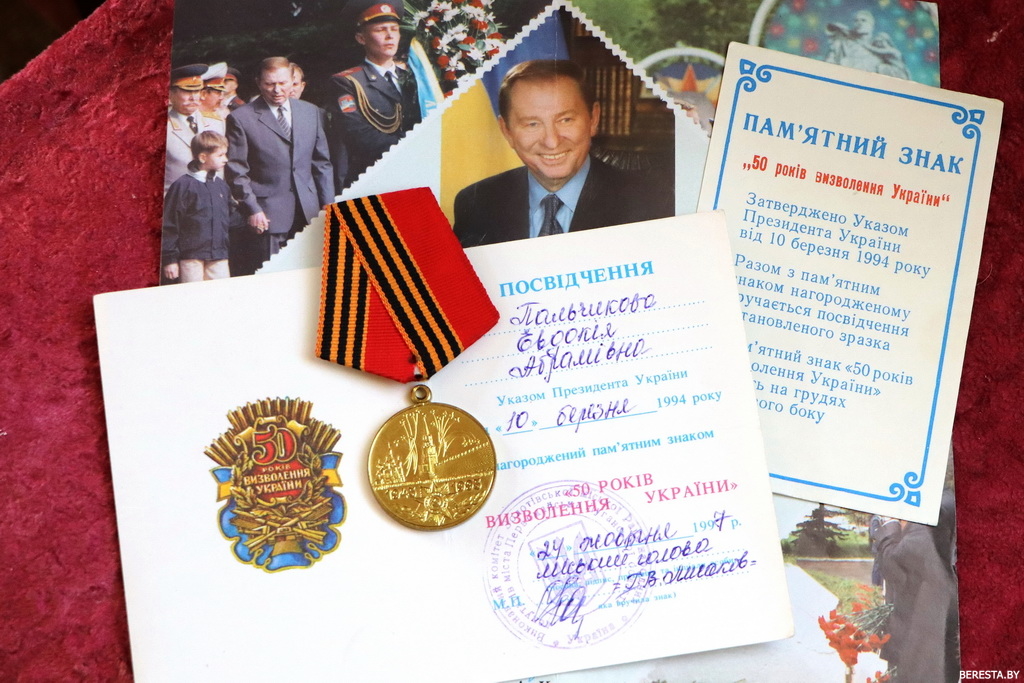 Евдокия Абрамовна Пальчикова награждена памятным знаком «50 лет освобождения Украины». У женщины есть украинское удостоверение «Участник войны» и справка из сельсовета о том, что сразу после освобождения Ярцево-Сурменево в сентябре 1943 года, она еще несовершеннолетней девочкой работала в восстановленном колхозе «Трудовик». Стране и армии срочно нужно было продовольствие, и на работу брали даже детей.