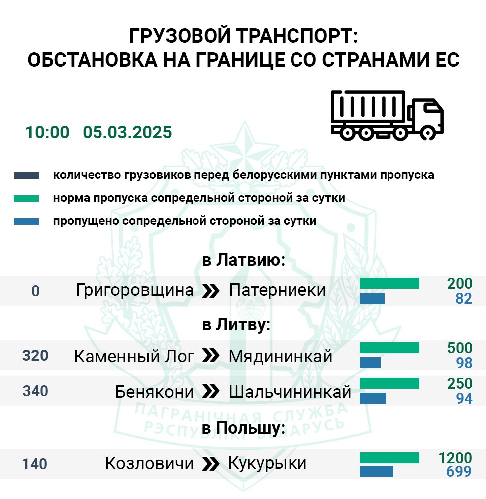 За сутки очередь грузовиков, ожидающих въезда в Евросоюз, увеличилась до 800 единиц. Меньше всего фур за 24 часа проследовало в Литву через погранпереход Мядининкай (Каменный Лог), его контрольные службы оформили лишь 19% транспорта от нормы.