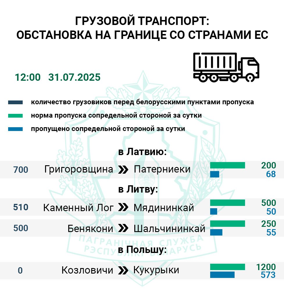Въезда в Евросоюз перед двумя функционирующими литовскими пунктами пропуска Мядининкай (Каменный Лог) и Шальчининкай (Бенякони) ожидают 1010 фур. В Латвию через единственный пункт пропуска Патерниеки (Григоровщина) — 700.