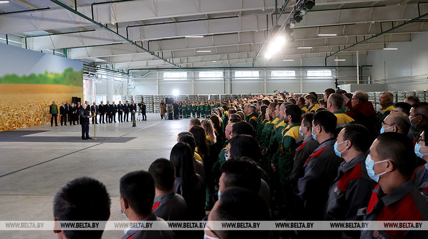 Президент Беларуси Александр Лукашенко принял участие в церемонии официального запуска производства комбикормов и аминокислот Белорусской национальной биотехнологической корпорации в Пуховичском районе, передает корреспондент БЕЛТА.