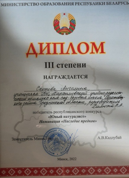 Ангелина Скокова выступила в Республиканском центре экологии и краеведения с презентацией своей творческой работы и была награждена дипломом III степени в номинации «Наследие предков», а творческая работа учащихся Большеберестовицкой средней школы заняла первое место в номинации «Сельское подворье».