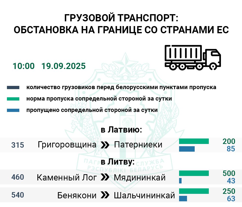 Въезда в Литву перед пунктами пропуска Мядининкай (Каменный Лог) и Шальчининкай (Бенякони) ожидают 1000 грузовиков и 340 легковушек. Сотрудники контрольных служб сопредельных погранпереходов за с понедельника впустили из Беларуси 18% и 50% транспорта от нормы соответственно.