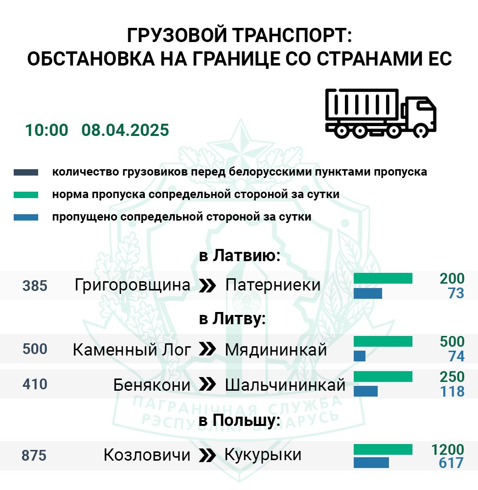 За сутки очередь большегрузов, ожидающих въезда в Евросоюз, увеличилась на 230 единиц. Меньше всего фур за 24 часа проследовало в Литву через погранпереход Мядининкай (Каменный Лог), его контрольные службы оформили всего 15% транспорта от нормы. Через литовский Шальчининкай (Бенякони) за сутки в ЕС въехало лишь 47% большегрузов.